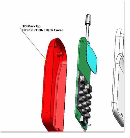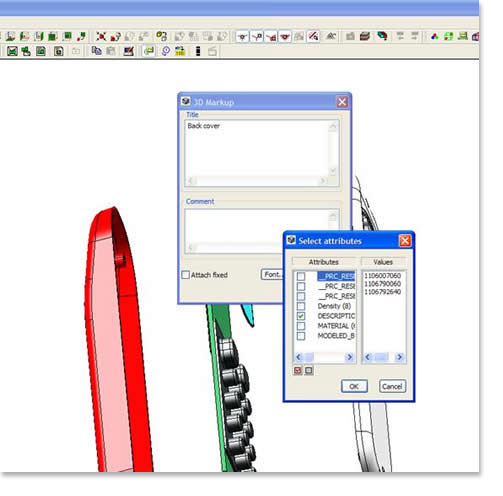 Select the rear cover and then click the 3D Mark Up icon. Notice I can select various attributes from the part file and add them to the mark up.