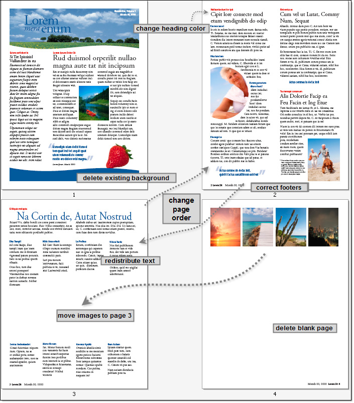 The current document layout consists of four pages, although one is destined for deletion (Figure 1). You’ll see callouts indicating the areas where changes are required.