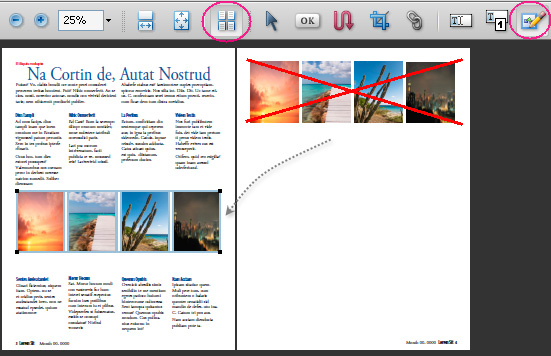 In the project, starting with major edits includes changing page order, moving images and deleting an extra page. Since the swapping and deleting can both take place in the Pages panel, the first thing to do is move the images from page 4 to the current page 3. To do that, click the TouchUp Object tool on the Advanced Editing toolbar, shown at the upper right in Figure 2. Select the images and copy/paste them to the receiving page. I’d do the page layout later.
