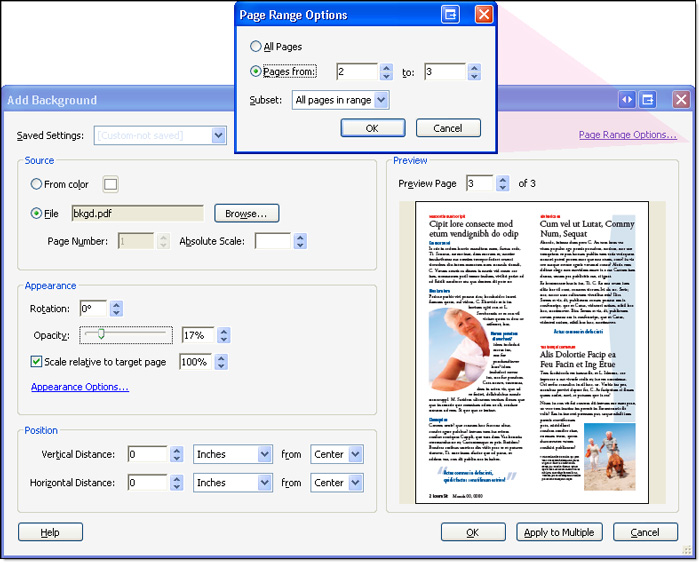 Page 1 contains decorative header and footer elements, so it doesn’t need a background. Fortunately, Acrobat 9 allows you to apply backgrounds to select pages rather than the whole document. To configure and apply the graphic background to pages 2 and 3, choose Document > Background > Add/Replace to open the Add Background dialog box (Figure 5).