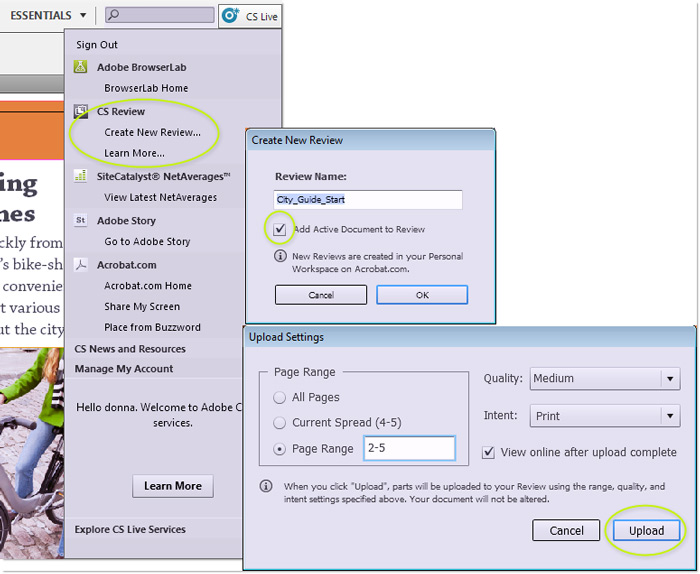You need to log into Acrobat.com either before or initiating the process. Assuming you’re already logged in, follow these steps to start a CS review: