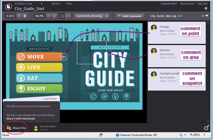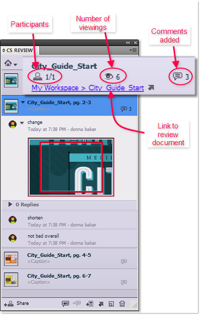 A CS review, unlike regular PDF-based reviews, uses a snapshot of your content. The snapshot is uploaded to your personal workspace on Acrobat.com. You can add comments in the browser or the CS Review panel in the application. Unlike PDF-based reviews, the CS Review is available for free for the first year only, at which time it becomes a subscription service.