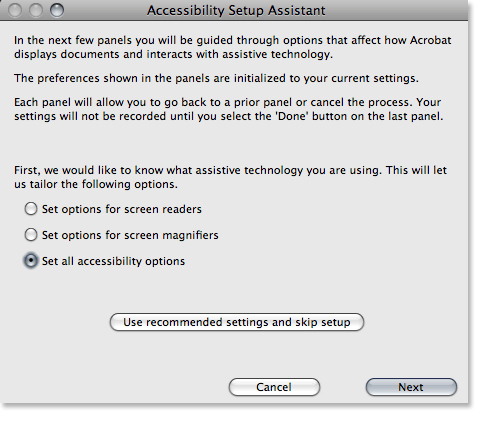 Figure 6: The Accessibility Setup Assistant provides various preferences for displaying PDFs and reading them with assistive devices.
