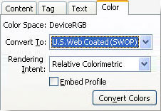 Here's an easy fix: Select the image with the TouchUp Object tool, and choose Properties from the shortcut menu. Click the Color tab in the TouchUp Properties dialog box. The existing color space is shown at the top of the dialog box shown in the figure; click the drop-down arrow to choose another color space and specify an intent, if necessary.