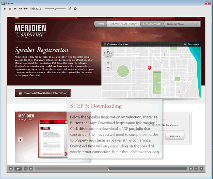 Your conference registration process also concerns you. It's a secure process involving a number of steps and screens—and your problem now. The web folks tried pop-up messages, which seemed to make registration more confusing. You tried writing a list of steps, but that didn't help much either. It would be great to have something that shows the process step-by-step, wouldn't it? You decide to put together a simple Adobe Captivate demo showing the steps involved.