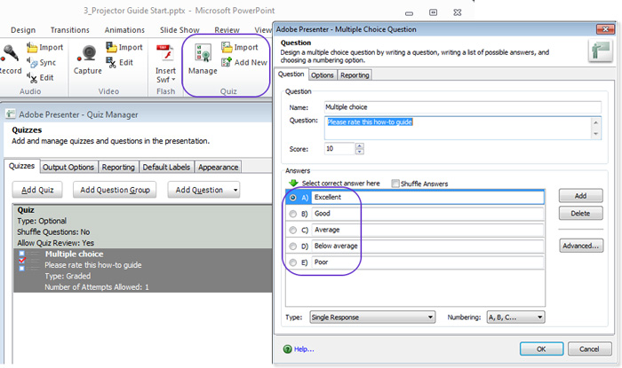 Work directly from PowerPoint to redefine the Projector User Guide as an interactive presentation using the Presenter 7 plug-in. Click the Adobe Presenter tab to open the ribbon, and follow these steps to prepare the publication in Office 2010: