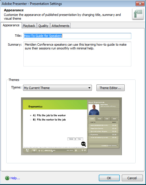 You're including a PowerPoint guide to train speakers to run your projector system. Based on your experience, users understand more if the presentation includes audio narration. Rather than simply adding audio to the Powerpoint presentation, you decide to package the presentation with Adobe Presenter. Along with providing the information the users need, the wrapper lets you add your photo and contact information, a simple way to personalize the training piece.