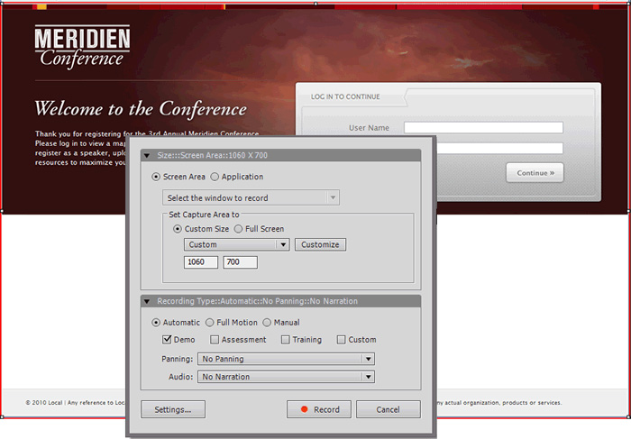 Captivate 5 lets you capture content from the screen and configure it for output in a variety of formats. You can easily create a short demonstration to guide users on how to use the online registration for the conference. Here's a brief rundown of the process: