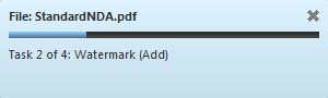 Clicking on the next button starts the Action. What happens next depends entirely on how the action is set up. For example, the "Start With" entry on the dialog in Figure 2 shows that this action will operate on the PDF currently open in Acrobat. So when "Next" is pressed, each of the "Steps" listed is applied to the current PDF in the order listed. These steps can have preset values, in which case they are applied silently, or they can be marked as interactive, in which case the step would display an input dialog. As each step is processed, Acrobat displays a progress dialog at the bottom right of the page display area (Figure 3).