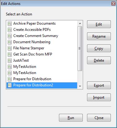 Not only are Actions a powerful productivity tool because they offer a way to group operations, they are also powerful because they can be shared easily with other users. The Actions list dialog (Figure 5) has buttons for both importing and exporting Actions. Sharing is simply a matter of exporting an Action to a ".sequ" file and then e-mailing the file to another user with Acrobat X. To import the Action, all the user has to do is double click on the file icon (Figure 8).