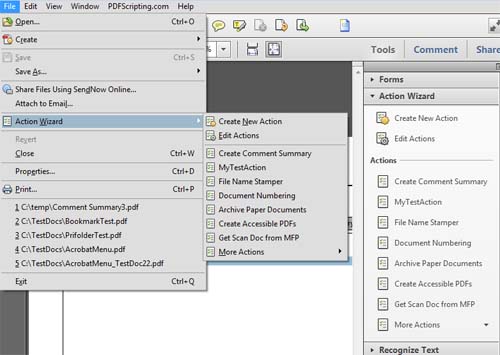 5, 2015-10-22 22, 2015Window 7, Adobe Acrobat XI Pro, None of the Actions show under Action wizard. I can create, Manage or find more on-line, not use any including one I just created. How to I get the actions to display? I also do not have the option to see the Action Wizard in the File menu.