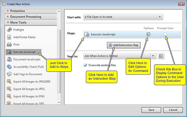 Finally, when all the steps in the Action are complete, Acrobat will perform the "Save To" operation. As shown in Figure 2, the "Save To" for this action is set to "Ask When Action is Started," which displays the file "Save As" dialog. This text is a bit misleading since the user is actually asked at the end of the Action, not when it is started.
