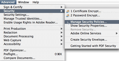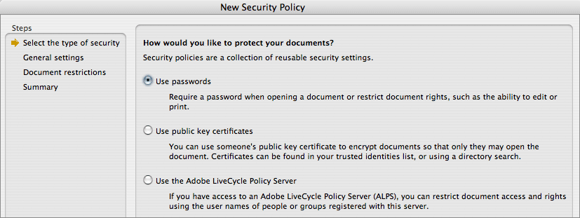 You can create three types of security policies: password security (to password-protect documents), certificate security (to encrypt documents for a list of recipients) and Adobe LiveCycle Policy Server policies. Creating policies for password and certificate security lets you reuse the same security settings for a set of PDFs without having to change security settings for each. The policies for password and certificate security are stored on the local computer.