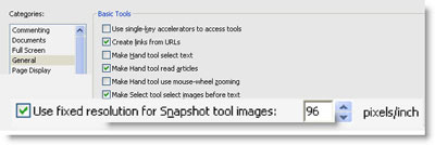 If you work with snapshots on a regular basis and use them for the same sort of output--such as online use--save yourself some time by setting a preference. Choose Edit > Preferences or Acrobat > Preferences to open the Preferences dialog box, displaying the General preferences. Select the Use Fixed Resolution For Snapshot Tool Images option and specify the resolution in pixels (Figure 5).