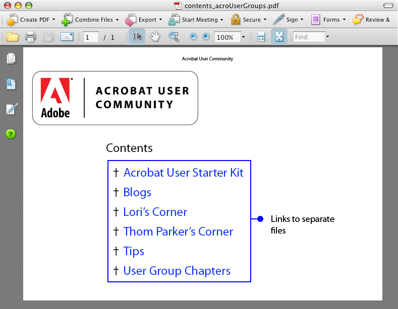 If I click a link from the contents page and view a linked file in Acrobat, I need a way to get back to my contents. Additionally, if I view one linked document, then want to jump to another linked document while bypassing the contents, I need to have interactive links in each of my PDF files.