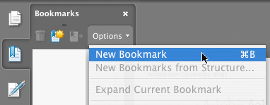 My first step is to create a bookmark that will open one of the documents in my collection. I click the Bookmarks panel icon to open the panel and click Options to open the drop-down menu. From the menu commands, I select New Bookmark as shown in Figure 2. Alternately, you can use Ctrl/Command + B.