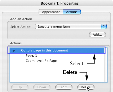 Press Enter /Return after typing a name for the bookmark and right-click (Windows) or Control-click (Macintosh) to open a context menu. From the menu options, select Properties to open the Bookmark Properties dialog box, then click the Actions tab. By default, the bookmark you created captured the page view as the link destination. Click the first line of text in the Actions area and click the Delete button to remove the action (see Figure 3).