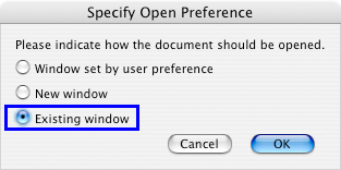 After clicking the Select button, the Specify Open Preferences dialog box opens. Now you need to make an important decision. If you click New Window, the linked file opens in a new window while your host document (in this case the Blogs PDF) remains open. To simplify the user navigation and keep the user’s screen free of multiple open PDFs, use the Existing Window option (see Figure 5). Choosing this option means that as a user clicks a bookmark, the current file closes as a new file opens, thereby appearing as though the user is working with a single document.