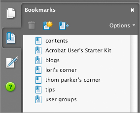 I could use buttons on each page, but with PDF documents that have many pages, the overhead added with form fields or links would increase the file sizes enormously and slow down the user's page navigation—not to mention all the work required to create buttons/links on every page. A better alternative is to have a set of bookmarks in each PDF file where the bookmark is visible on all pages and linked to all files in your collection.