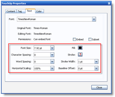 Figure 6: TouchUp Text Properties window.