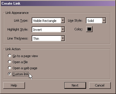 A Link Object on a PDF document is similar to an invisible button field - the cursor changes as it passes over it, it’s part of the tab order, and it activates some kind of action when it is clicked. It is different from a button in that it has no appearance other than an outline and it has only a single trigger (similar to the Mouse Up trigger for a button). The link object is intended to provide a kind of hyperlink capability for Acrobat. In fact, this is the first option displayed when the link is created, but it can also do anything a button action can do, including run a JavaScript.