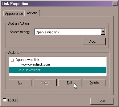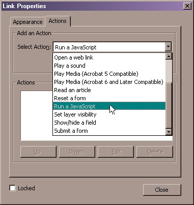 2. Click Next. The Link Properties dialog is displayed (Figure 2). In the Select Action pull down list, select Run a JavaScript.