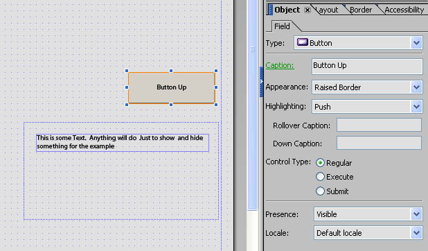 To build our LiveCycle example, start up LiveCycle Designer and create a new document. Add a regular button and a subform to the form. For the example, it doesn’t matter how they are placed. Set the caption on the button to "Button Up" and add some visible elements to the subform just so there is something in it. A static text element is fine. The default properties for both elements should work, but to be sure, each should have the following properties (Figure 3 and Figure 4):