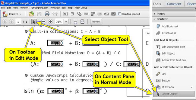 While this is all you need to know to get started using calculations in Acrobat forms, there is more. If you want to use advanced features or do something more complex than described in the example file SimpleCalcExample.pdf , can find information in both the Acrobat JavaScript Scripting Reference1. You may also want to look up the core JavaScript Math object, which provides details on advance mathematical functions. Find information on this object in any standard JavaScript reference, or on line at the Mozilla developer site.
