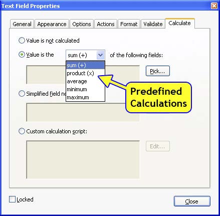In reality, all three are JavaScript, but for the first two, Acrobat builds the JavaScript code for us. Calculations are only available for text fields and are accessed through the Text Field Properties dialog.