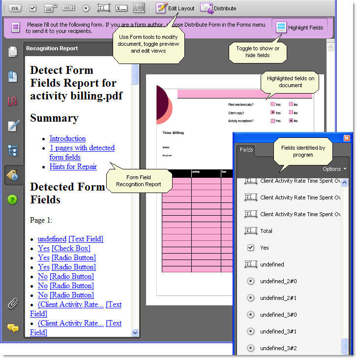 The form usually needs modifications to the automated field synthesis results such as renaming fields, adding additional fields, configuring field parameters and so on. You can refer to a number of articles, tutorials and tips on AcrobatUsers.com for further information.