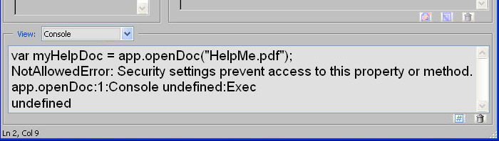 However, since the Help file is separate from the form, there is no guarantee it will be available. If the help file is not there, then the app.openDoc() function will throw an exception. Try running the app.openDoc() line of code in the Console window to see what happens. The screen shot below is from Acrobat 8 Professional, version 8.12. Different versions of Acrobat may report different error messages.
