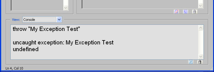 Remember that “e” parameter in the catch(e){} block. It’s the thing that’s thrown the message. Normally it’s an Error Object, but the fact is it could be anything- a string, a number, a custom object, anything. An exception is thrown with the keyword throw, so the following code throws an exception using a string as the message. Try running it from the Console window: