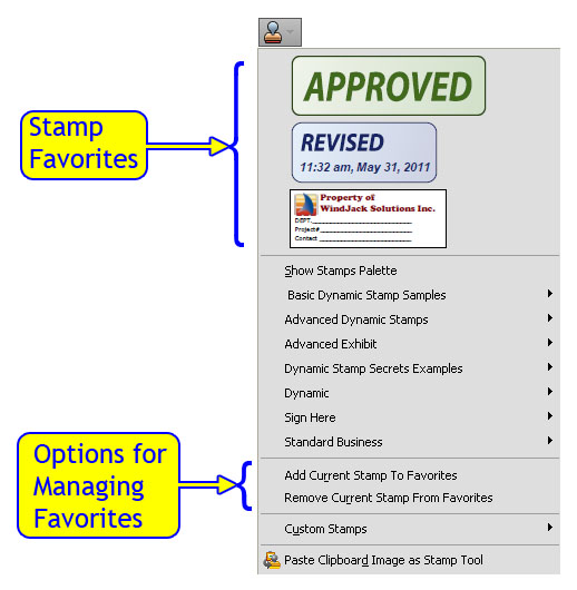 The only real differences between versions are the convenience features. Typically, people who use stamps use them heavily, so it is important to make stamp re-use as convenient as possible. For example, in previous versions of Acrobat, the most recently used stamp was saved. Clicking on the top level stamp toolbar button re-activated that stamp, providing an easy way to re-use the same stamp without having to walk the full stamp menu. Of course, this feature only works for one stamp at a time. Acrobat X does not have this feature. Instead, to make handling multiple stamps more convenient, Acrobat X uses a Stamp Favorites list (Figure 5). Unfortunately, the last stamp used is not automatically added to this list. Each “Favorites” entry must be added manually by the user.