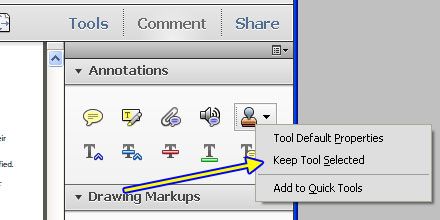Another convenience feature, and arguably the best one for stamps, is the “Keep Tool Selected” option. To access this option in Acrobat X, right-click on the Stamp Tool icon in the Comment Panel, (Figure 6). When this option is checked, Acrobat keeps the currently selected stamp activated so that every mouse click places a new copy of the currently selected stamp. This is not a new feature in Acrobat X. It has been around for many versions of Acrobat, but unfortunately in previous versions, it was always very difficult to access, so most users did not even know it existed. The right-click menu in Acrobat X is a major improvement.
