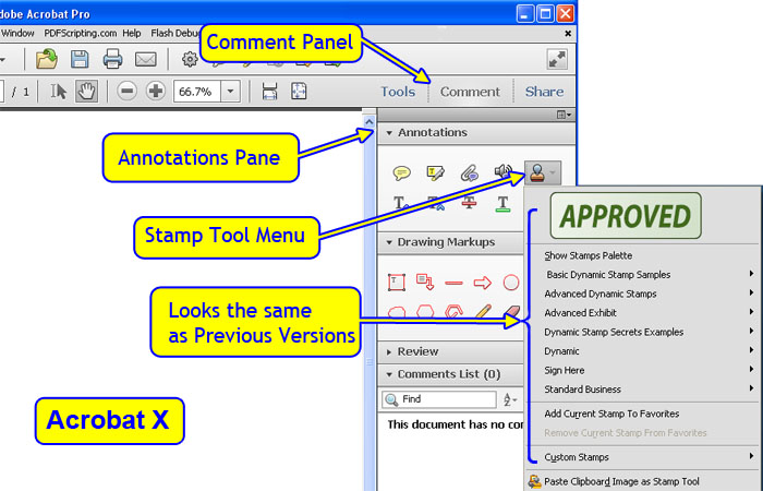 Overall, stamps work the same in Acrobat X as they did in previous versions of Acrobat. The only changes are related to the user interface for accessing and using the stamps. For regular stamp placement, the user experience has improved because of better convenience features. For scripting, the only change is that the stamp menu items do not exist, so they cannot be used in a script. All other connections between stamps and scripting are unchanged.