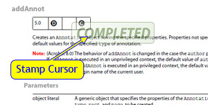 Automation scripting is a bit different. There are two ways to automate stamp placement-- by using the doc.addAnnot() function, and by running the menu item associated with a specific stamp. Each method has a different effect. The doc.addAnnot() function provides direct control over all stamp parameters, and it can be used in a script that performs complex interactions with dynamic stamps. It is also the most difficult option to script, mostly because it requires the script to calculate a page location. The good news is that no changes have been made to how stamps are automated with the doc.addAnnot() function. So far, so good, both dynamic stamp scripting and the doc.addAnnot()function are the same as in previous versions. If you use either of these scripting techniques, your stamps are compatible with Acrobat X.