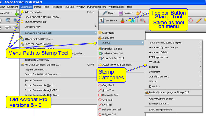 Figure 1 – Access to the Stamp tools in Acrobat 9 and earlier.