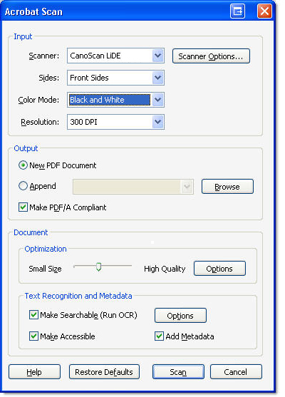 One of several methods for producing an Adobe PDF file is by scanning documents into Acrobat. Over the last few versions of Acrobat, we’ve seen a gradual improvement in the integration of scanner software with Acrobat and improvements in the accuracy of the text capture. Acrobat 8 Professional continues that trend, offering an improved OCR engine, easier file optimization and the ability to create a PDF/A standards-compliant document.