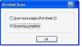 12. Once the page is scanned, the Acrobat Scan dialog box opens (Figure 2). Select Scan more pages to continue scanning or Scanning complete to finish and then click OK.