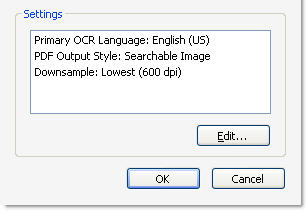1. Click Edit to open the Recognize Text – Settings dialog box. Choose options for OCR Language, Output Style, and Resolution and click OK to close the dialog box.